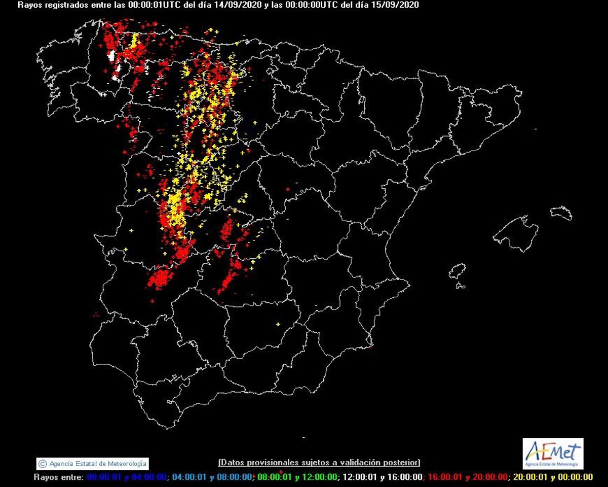 La comunidad autónoma de Castilla y León anotó un lunes de "gran actividad de descargas eléctricas" por tormentas con un total de 1.559 rayos registrados, según los datos aportados por la Agencia Estatal de Meteorología (Aemet) recogidos por Europa Press.
