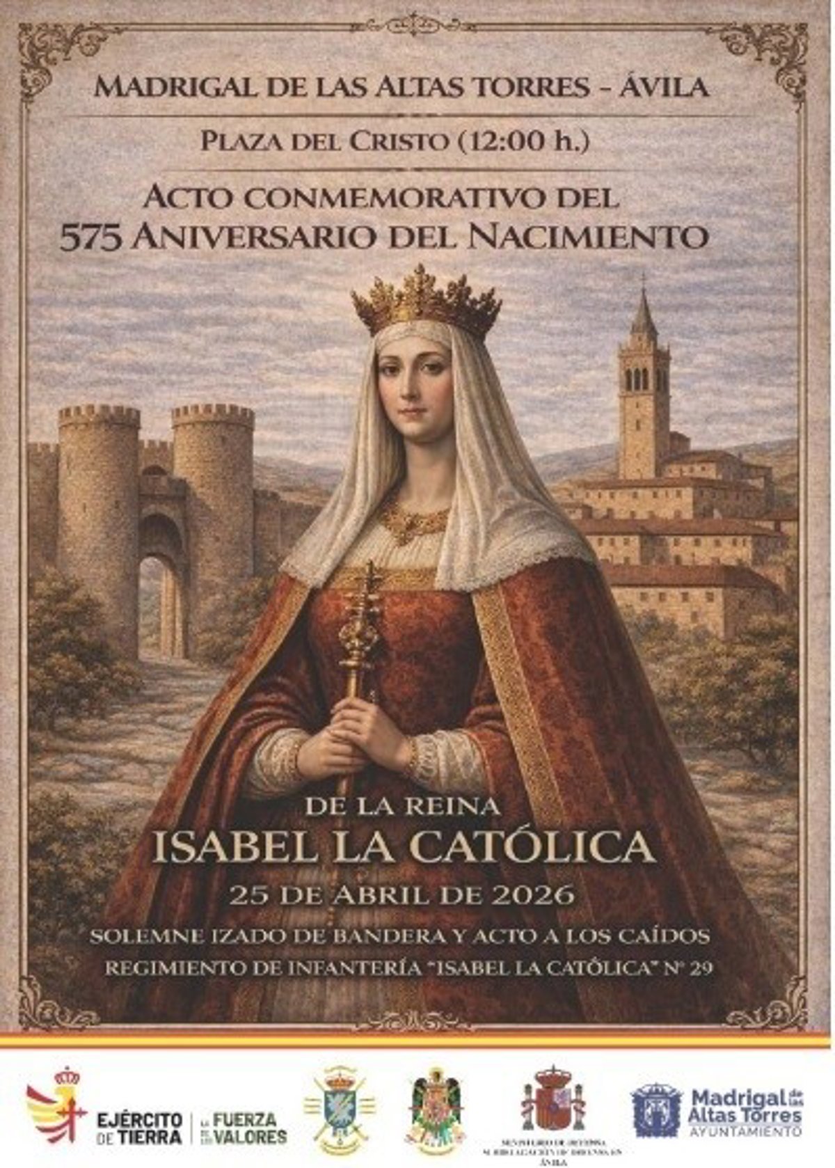 La localidad abulense de Madrigal de las Altas Torres acogerá este sábado a las 12.00 horas un acto conmemorativo del 575 aniversario del nacimiento de Isabel la Católica, protagonizado por el Regimiento de Infantería Isabel la Católica 29, perteneciente a la Brigada Galicia VII, con base en Pontevedra (Galicia).