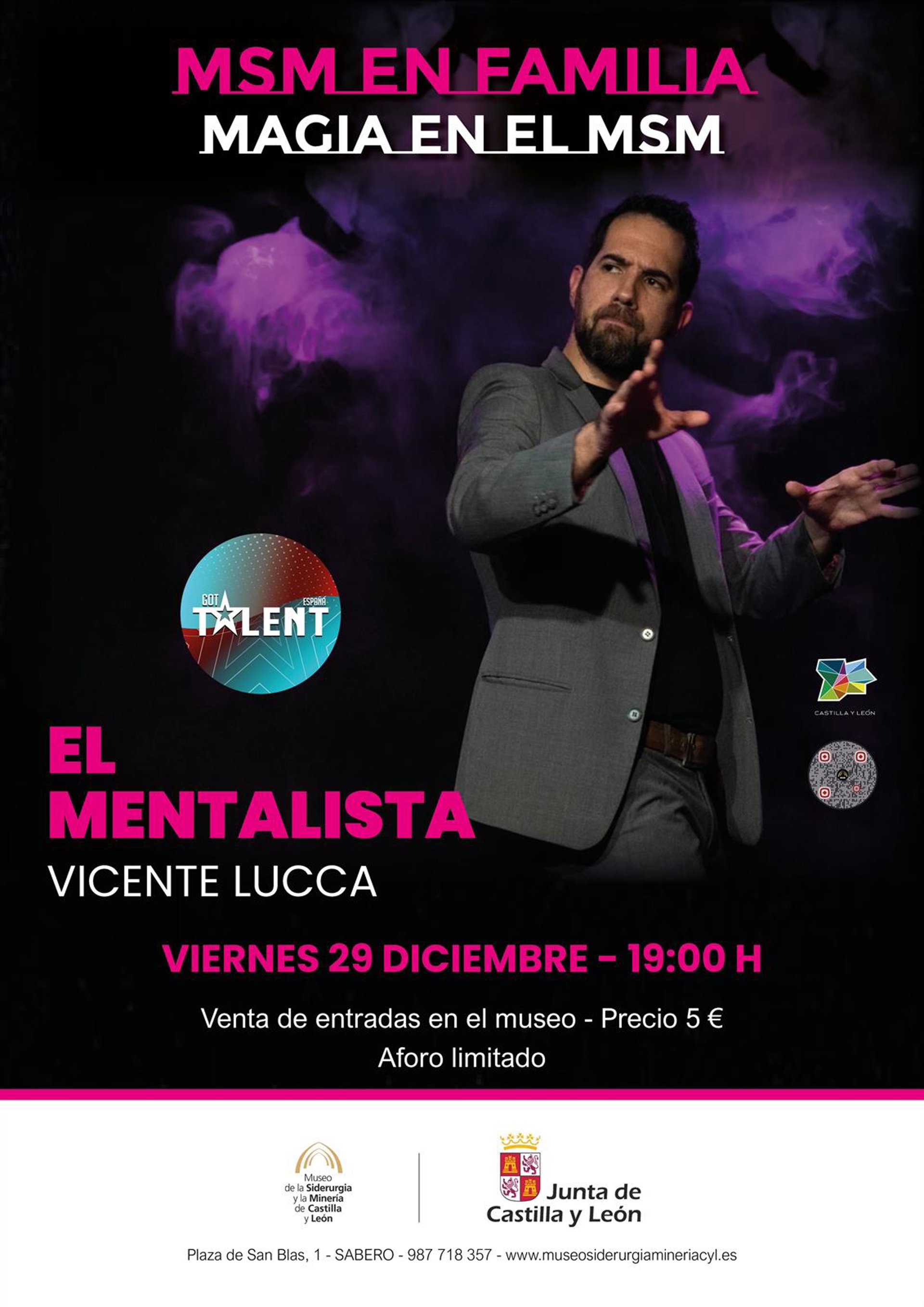 El mentalista Vicente Lucca, concursante en esta edición del conocido programa de televisión Got Talent, llevará su espectáculo al Museo de la Siderurgia y la Minería de Castilla y León, con sede en Sabero (León) este viernes 29, a las 19.00 horas.