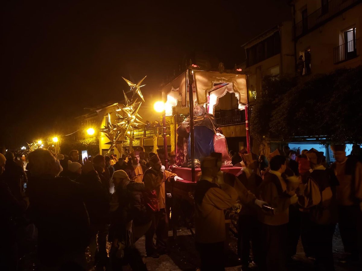 Desde la Plaza, los Reyes Magos han recorrido el resto de la Cabalgata en sendas carrozas, unas estructuras coloristas, formadas por una escalera en la que se han situado los pajes, ofreciendo más caramelos al público y, en la parte superior, bien visibles, los tronos de los Magos.