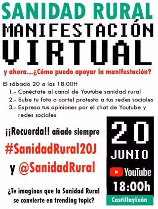 Entre los centenares de pancartas que han desfilado este sábado en Youtube, el medio rural se ha manifestado con lemas como 'No sin mi médico', 'SOS Rural', 'Mi médico en mi pueblo', 'La salud rural es de interés general', 'Los pueblos sin médicos mueren' o 'Somos personas, no pantallas'.