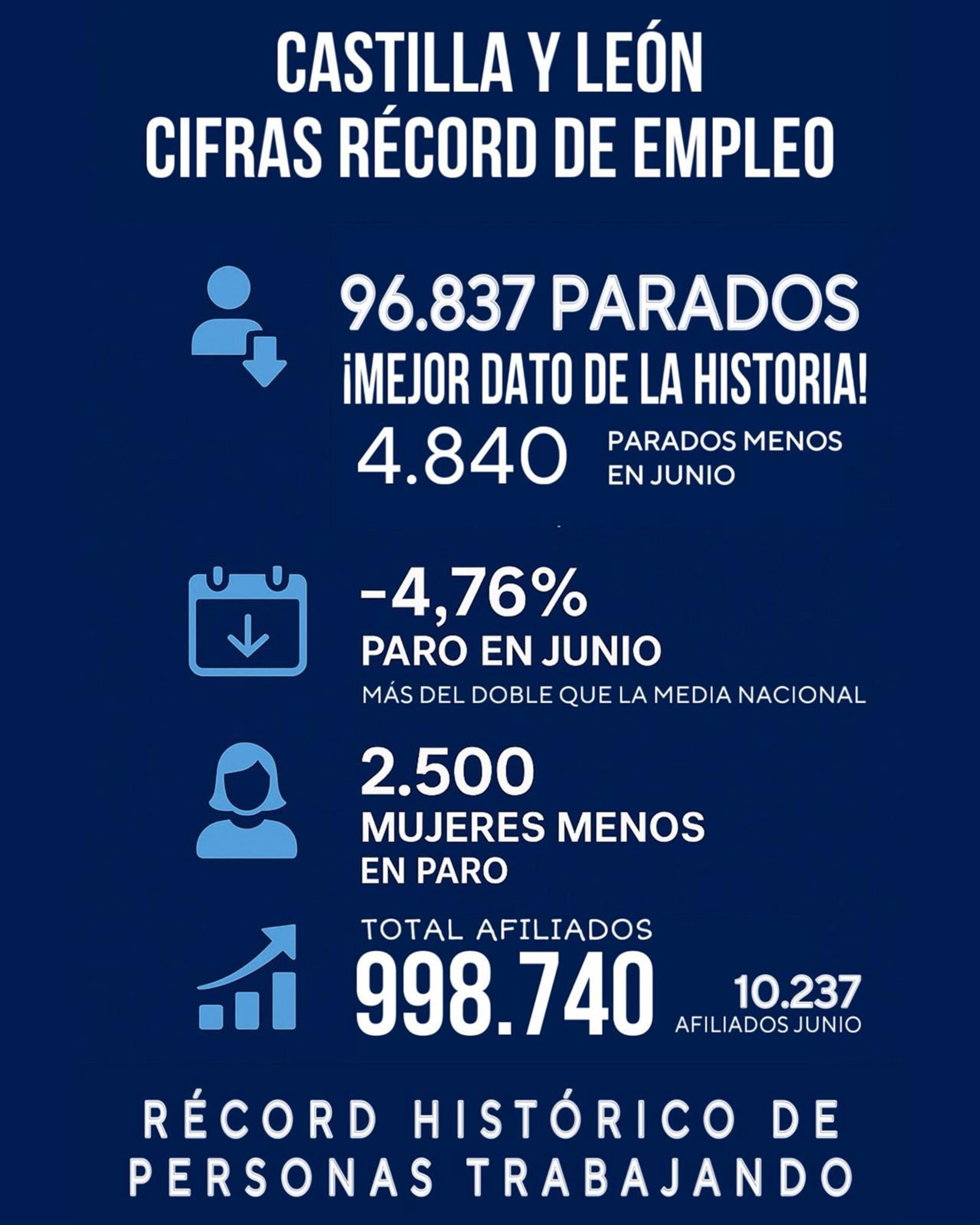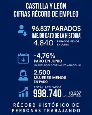 El presidente de la Junta de Castilla y León, Alfonso Fernández Mañueco, ha celebrado "los mejores datos de empleo y paro" de la historia de la Comunidad Autónoma, que ha cerrado el mes de junio con "cifras récord" con 96.837 desempleados y 998.740 afiliados a la Seguridad Social, a 1.260 del millón.