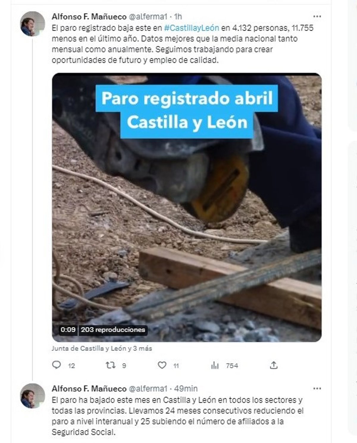Captura de los tuits publicados por Fernández Mañueco sobre los datos del paro conocidos este jueves - EUROPA PRESS