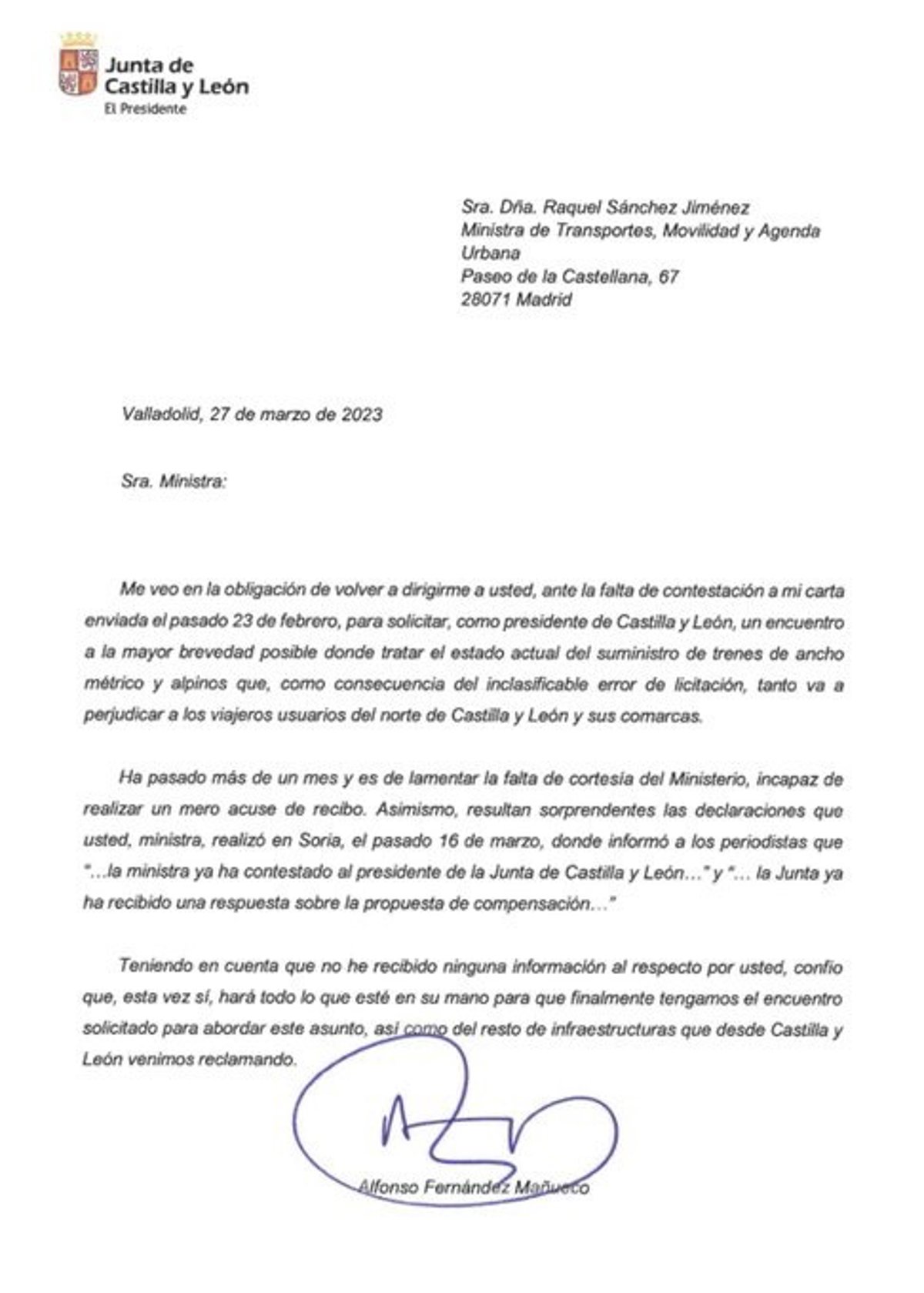 En la misiva, el presidente de la Junta reclama un encuentro "a la mayor brevedad posible" para tratar "el estado actual del suministro de trenes de ancho métrico y alpinos que, como consecuencia del inclasificable error de licitación" y sus consecuencias en Castilla y León.