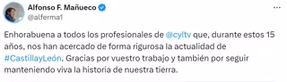 Así lo ha hecho el dirigente regional a través de un mensaje en su cuenta oficial de 'X', del que se hace eco Europa Press, con motivo de la celebración del 15 aniversario de la televisión de Castilla y León.