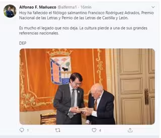 Así lo ha asegurado Fernández Mañueco en un tuit que ha publicado en su cuenta personal en el que se puede leer. "Hoy ha fallecido el filólogo salmantino Francisco Rodríguez Adrados, Premio Nacional de las Letras y Premio de las Letras de Castilla y León'.