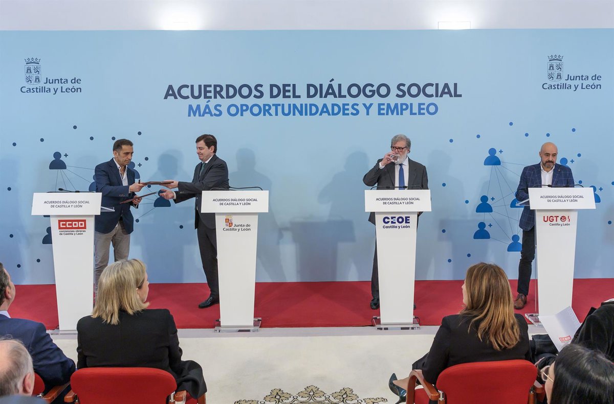 Estos son los principales mensajes que han trasladado el presidente de la Junta y los agentes del Diálogo Social tras rubricar este viernes cinco "importantísimos" nuevos acuerdos que dan continuidad a los cuatro que firmaron el pasado mes de septiembre, dos meses después de la salida de Vox del Gobierno de coalición en Castilla y León.