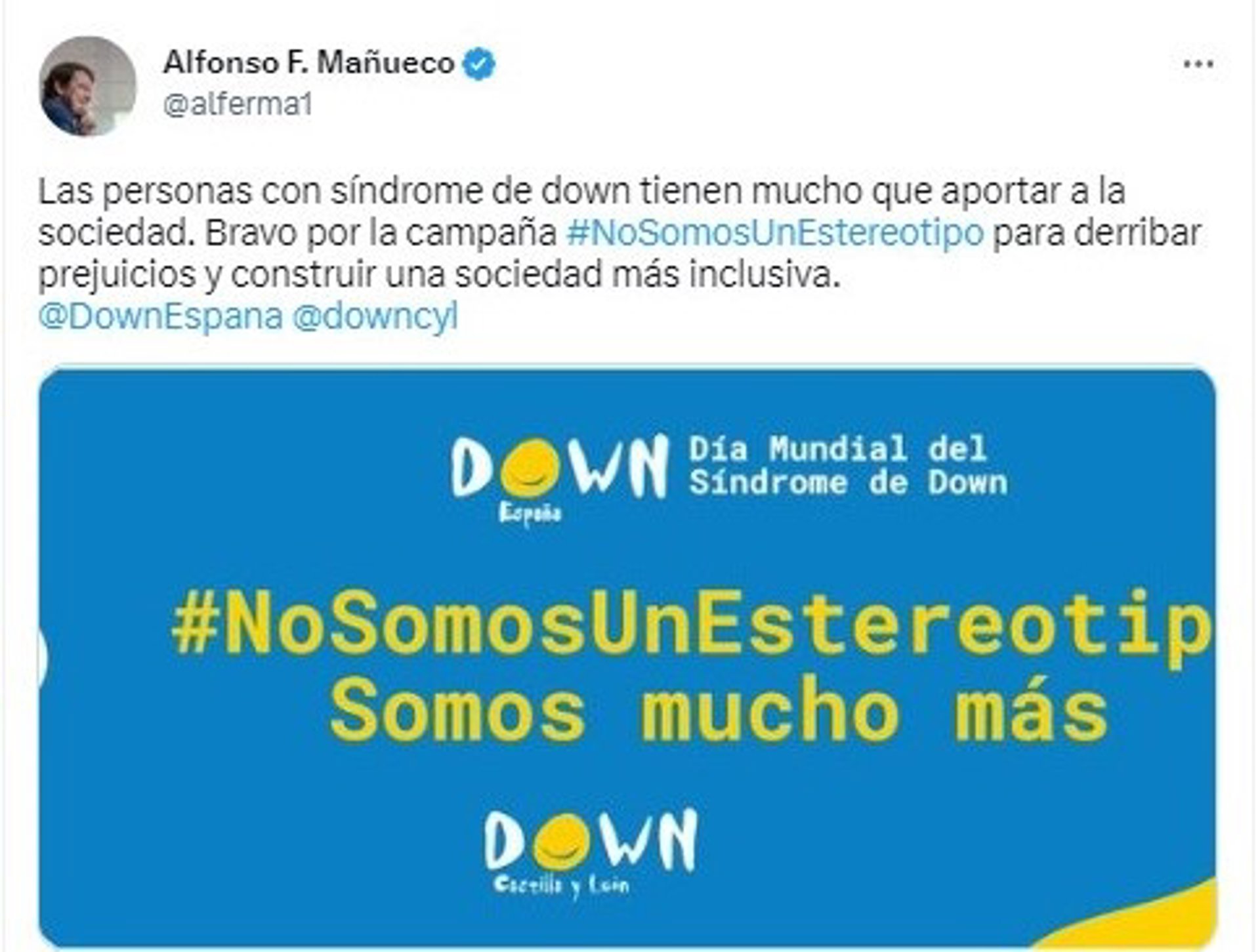 Fernández Mañueco ha realizado esta afirmación a través de un mensaje publicado en su cuenta personal de Twitter con motivo del Día Mundial del Síndrome de Down que se conmemora este martes, 21 de marzo.