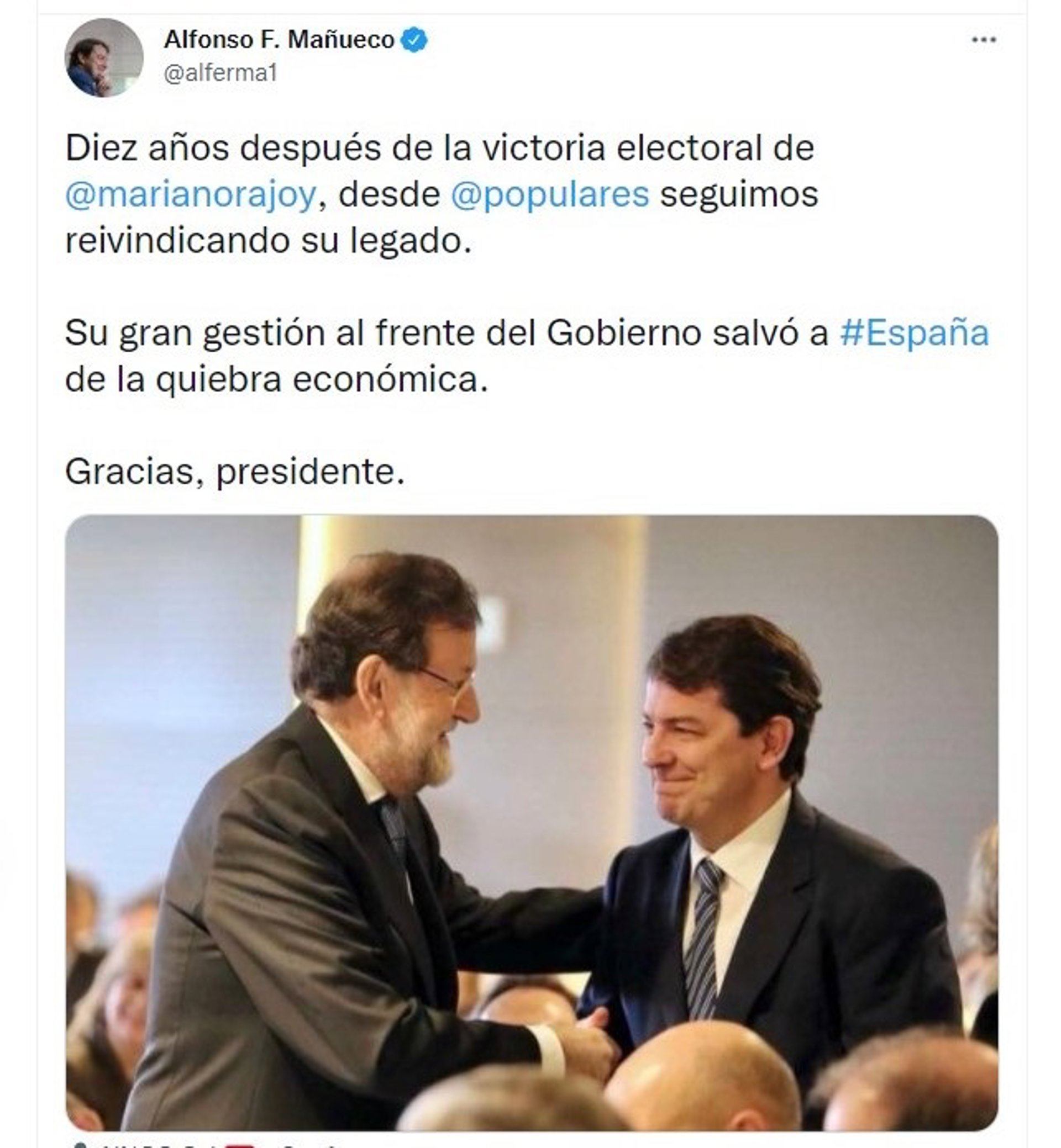"Su gran gestión al frente del Gobierno salvó a España de la quiebra económica", afirma el presidente de la Junta y del PP de Castilla y León que termina el mensaje con un "gracias, presidente" y acompaña el texto con una foto en la que recibe un saludo de Rajoy.