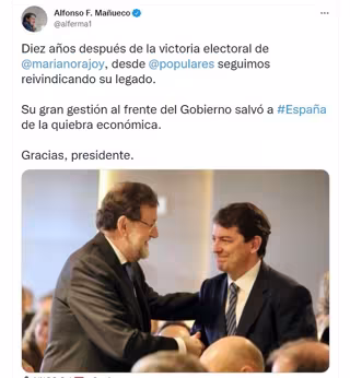 Fernández Mañueco se hace eco de otro mensaje del propio Rajoy en el que el expresidente recuerda que hoy hace 10 años desde que los españoles "encargaron" al PP "sacar a España de una crisis devastadora y lo hicimos". "Fue un honor dejar una España mejor que la que recibimos y un orgullo hacerlo con la ayuda de tanta gente y con la entrega generosa de todo el Partido Popular. A todos, gracias", añade Rajoy.