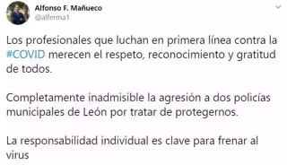El presidente de la Junta de Castilla y León, Alfonso Fernández Mañueco, ha condenado este domingo la agresión a dos policías locales en León, la cual ha tachado de "completamente inadmisible", ya que trataban de proteger a la ciudadanía.