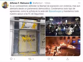 En su cuenta de Twitter, Fernández Mañueco ha escrito: "Condenamos todo tipo de agresiones, como la sufrida en la sede del @psoeburgos y mandamos todo nuestro apoyo a las FC de Seguridad".
