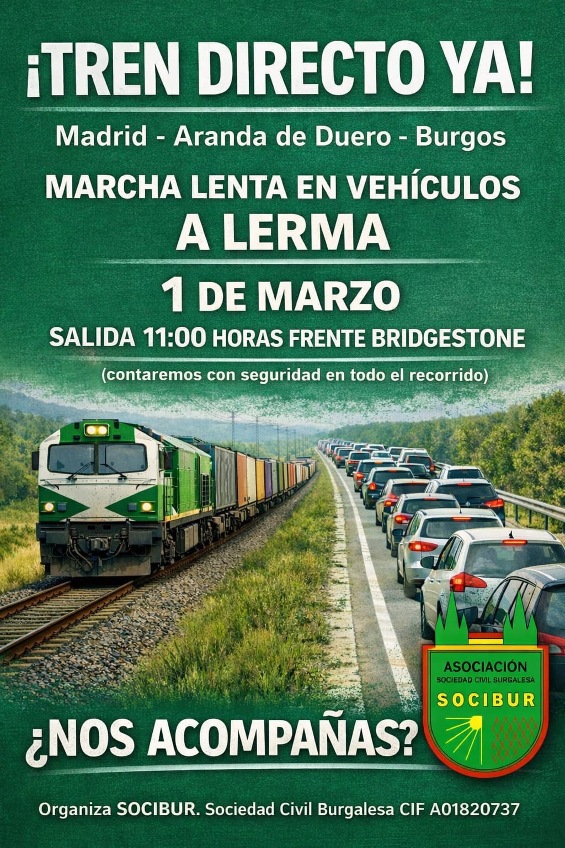 Una 'marcha lenta' de coches a 60 kilómetros por hora (km/h) en caravana recorrerá la A-1 desde Burgos capital hasta Lerma con el objeto de reivindicar la reapertura de la línea ferroviaria Madrid-Aranda de Duero-Burgos, conocida como el 'tren directo', que quedó "suspense" desde que en 2011 una máquina bateadora quedase sepultada en el túnel de Somosierra.