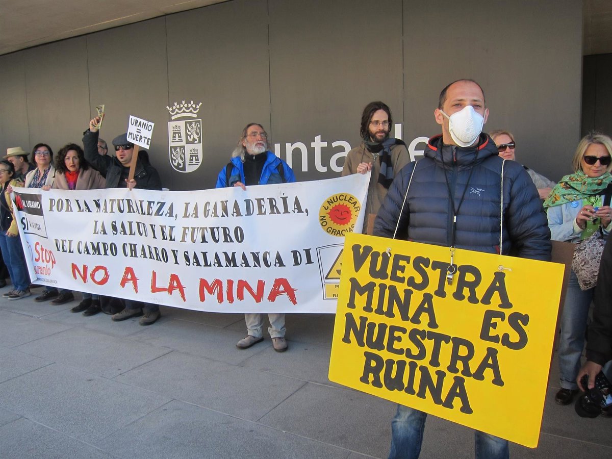 Más de un centenar de personas se han concentrado desde primera hora de este martes a las puertas de la Delegación Territorial de la Junta en Salamanca para pedir a la Administración que dé marcha atrás y no otorgue nuevas licencias para el proyecto de la mina de uranio en Retortillo (Salamanca).