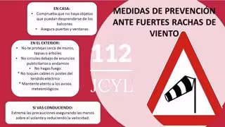 "Sigue estos consejos para evitar accidentes", advierte no obstante el Servicio de Emergencias 112 de Castilla y León que acompaña este mensaje con un gráfico con un repaso de las principales medidas de prevención ante fuertes rachas de viento como comprobar en casa que no hay objetos que puedan desprenderse de los balcones y asegurar puertas y ventanas.