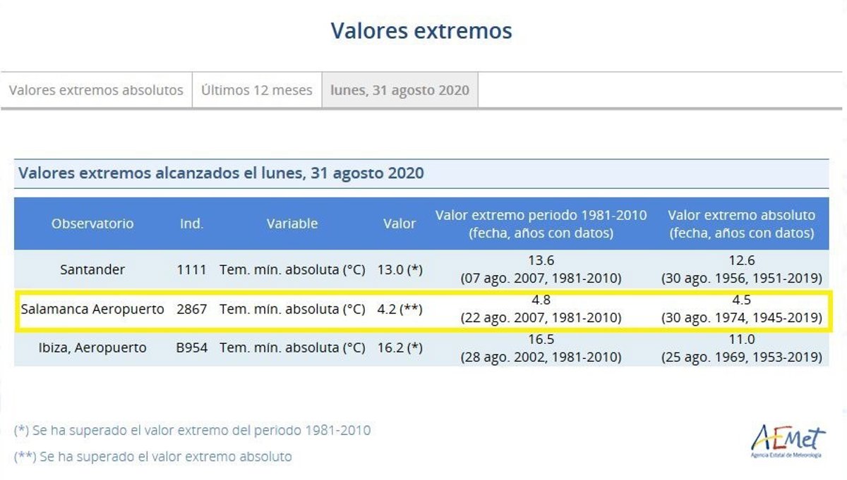 Según informa la Agencia Estatal de Meteorología (Aemet) en un mensaje en su cuenta de Twitter, esta estación meteorológica anotó en la jornada de ayer una mínima de 4,2 grados centígrados, "la temperatura más baja registrada en un mes de agosto desde que se tienen datos".