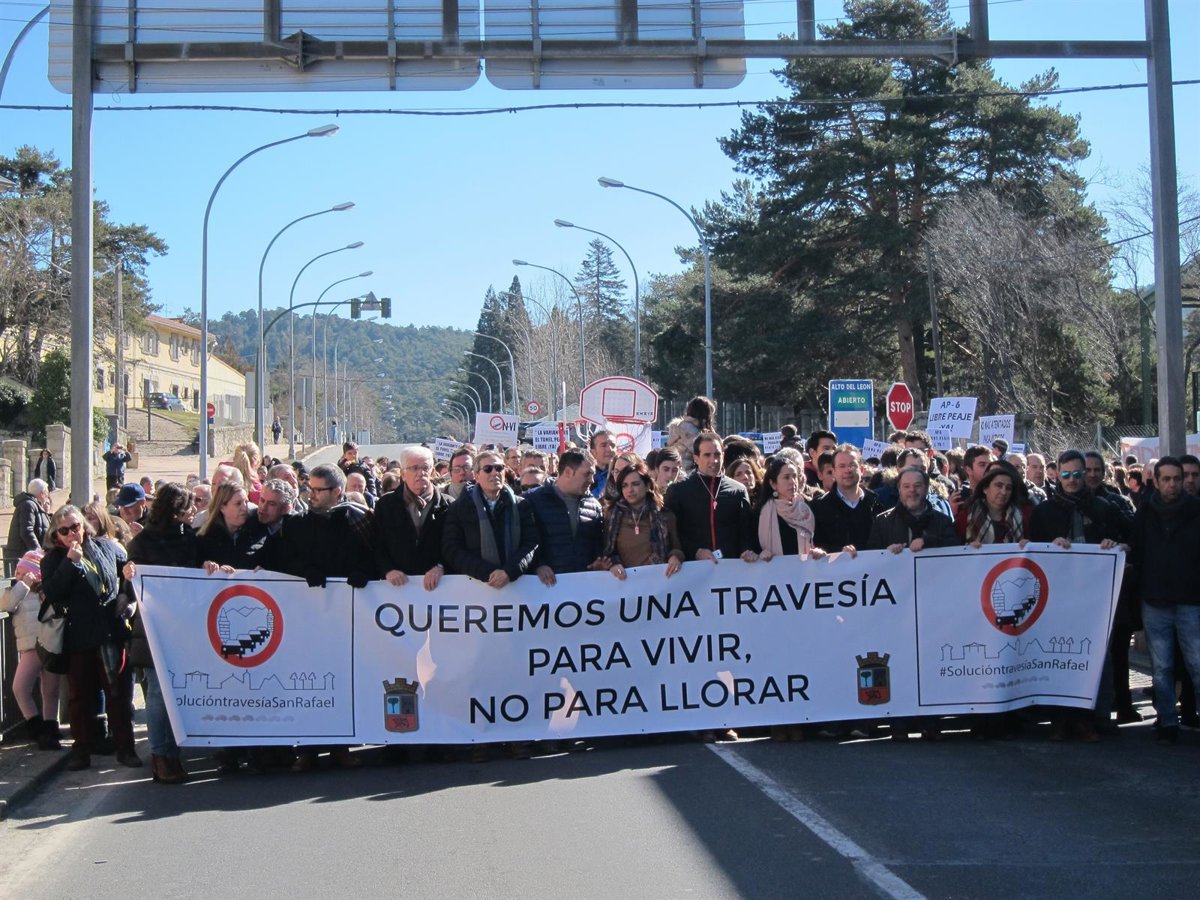 Alrededor de medio millar de personas han participado en la protesta que se ha desarrollado este sábado en San Rafael (Segovia), para reclamar una alternativa al paso del tráfico por la N-VI, a la altura de la travesía de esa localidad.