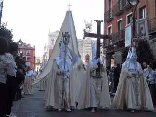 A la espera de la llegada de la procesión, a lo largo del recorrido se han apostado niños y mayores, muchos con sus sillas, para hacerse con un buen sitio desde el que no perder detalle de los pasos, que como es tradición han llegado acompañados del olor a incienso de las cofradías de Valladolid.