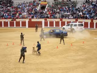 Tras ellos, ha tomado el protagonismo la Unidad Canina, cuyos efectivos han demostrado el nivel de disciplina de los perros entrenados, los cuales han participado en un simulacro de control con vehículos donde han impedido la huída de los sospechosos, han detectado un paquete peligroso oculto en los bajos de un todoterreno e incluso han reducido a un hombre en el interior de otro coche después de introducirse de un salto por la ventana.