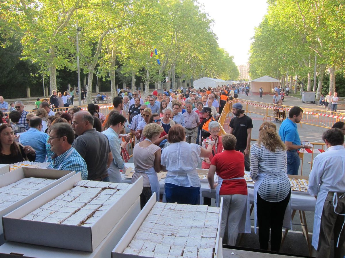 Miles de vallisoletanos se han dado cita esta tarde en la Acera Recoletos para poder degustar una de las 6.500 raciones de la tarta de San Lorenzo que los Confiteros han repartido desde las 19.00 horas.