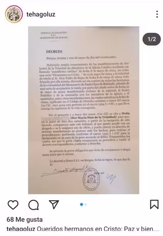 A través de su cuenta en Instagram 'Te hago luz' han publicado un documento con membrete del Tribunal Eclesiástico del Arzobispado de Burgos, con fecha del 31 de mayo, en el que se pide a Sor María de Sión que comparezca ante dicho Tribunal al que puede acudir acompañada de un abogado o se le asignará uno de oficio "para que pueda ejercer su derecho de defensa" tras los acontecimientos que se han sucedido desde que el 8 de mayo la abadesa, Sor Isabel, a través "del llamado manifiesto católico" comunicara que abandonaba la Iglesia Católica y rechazaba al Pontífice, el Papa Francisco.