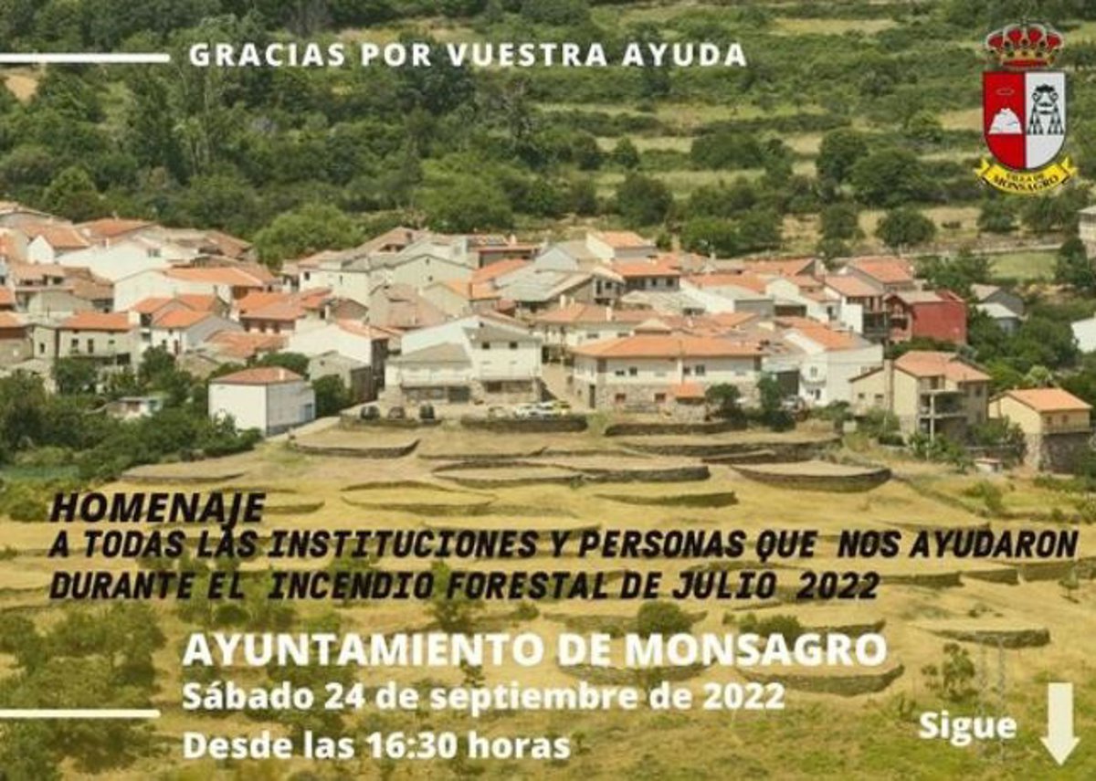 El Ayuntamiento de Monsagro (Salamanca), municipio que sufrió el pasado mes de julio uno de los incendios forestales más graves de la presente campaña, celebrará este sábado, 24 de septiembre, una jornada de homenaje a las personas e instituciones que trabajaron en la extinción.