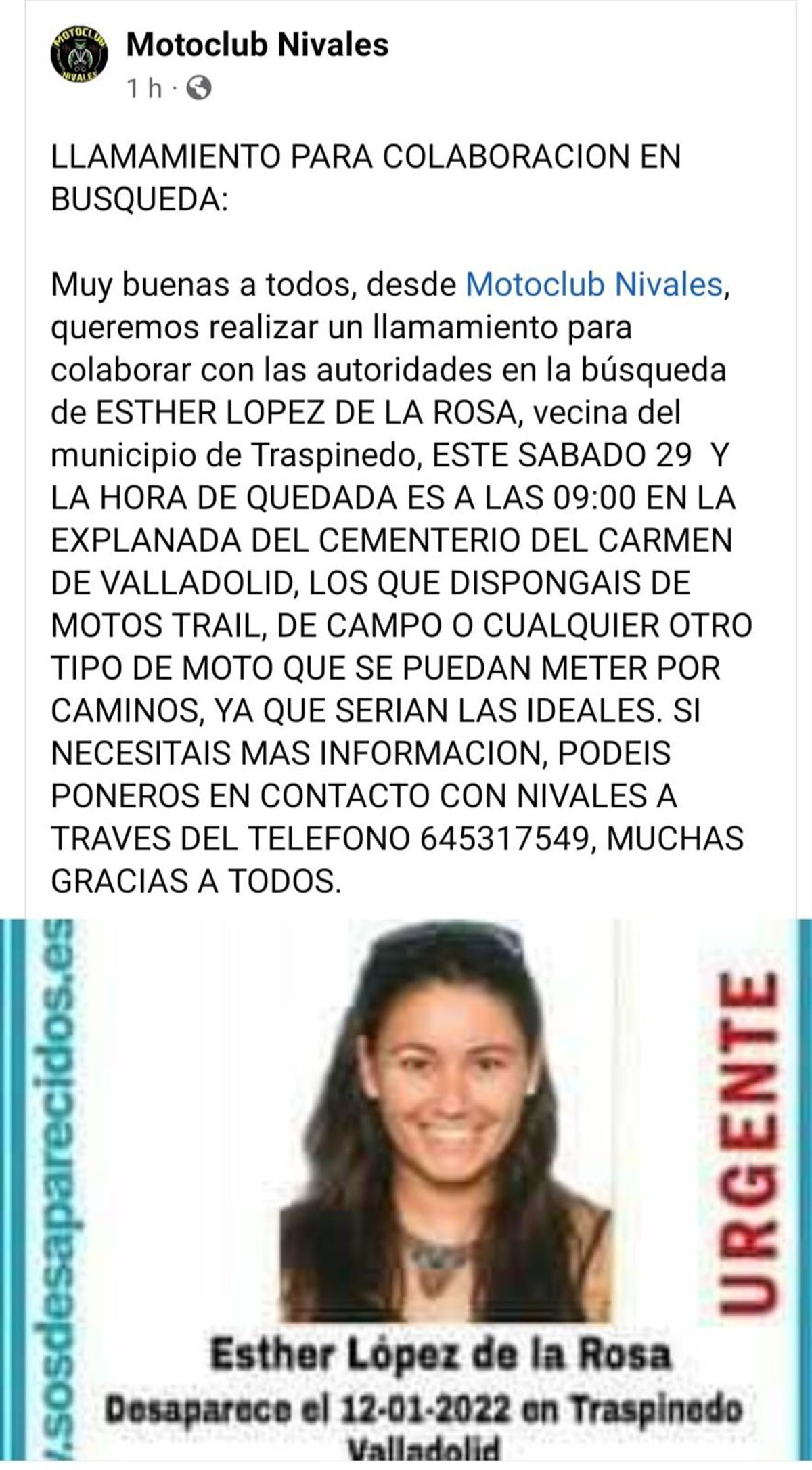 El motoclub vallisoletano 'Nivales' ha hecho un llamamiento para que motoristas que cuenten con motos de trail o de campo colaboren con las autoridades en la búsqueda de Esther López, que lleva desaparecida desde el día 12 de enero.