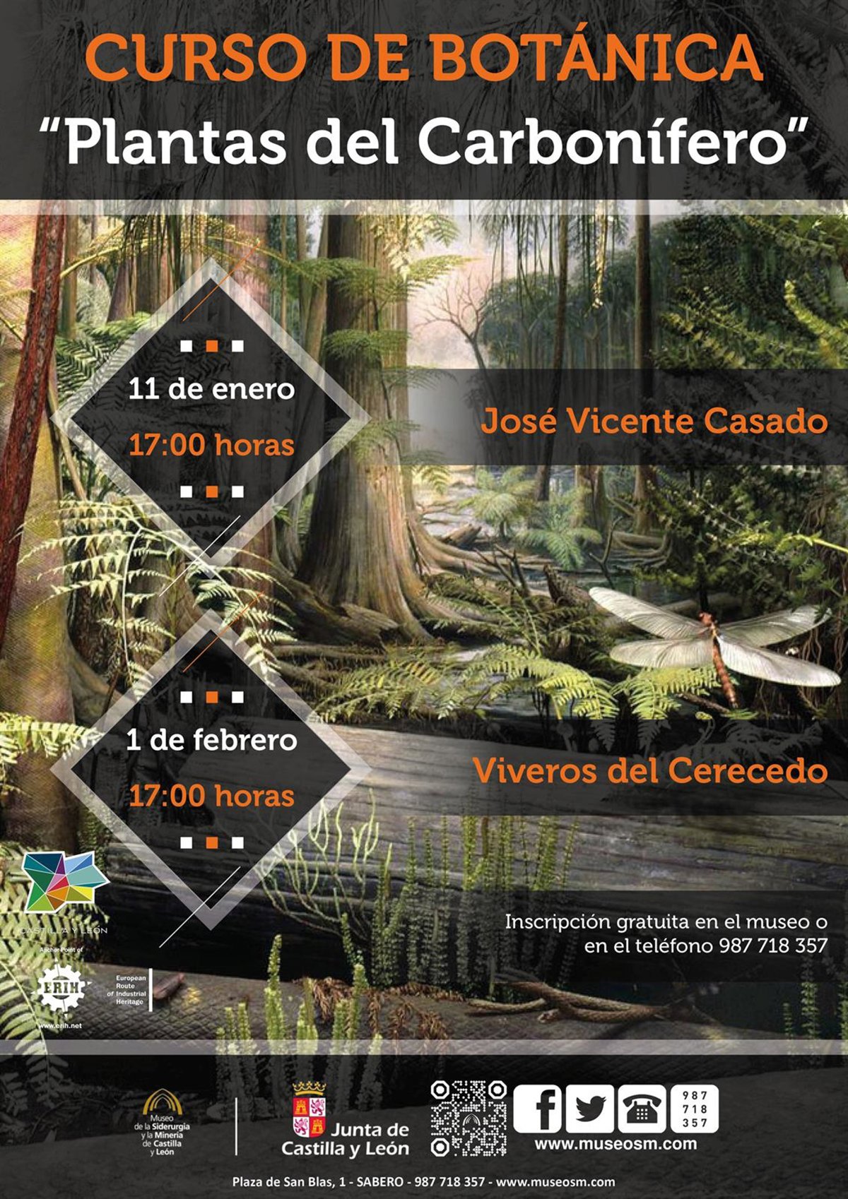 La primera sesión, estará impartida por José Vicente Casado, (investigador leonés, experto en geología y paleontología) el día 11 de enero, a las 17.00 horas. De carácter teórico, en ella se explicaran las principales plantas existentes en el periodo del carbonífero, con su variedad de helechos, cicadáceas, etc.