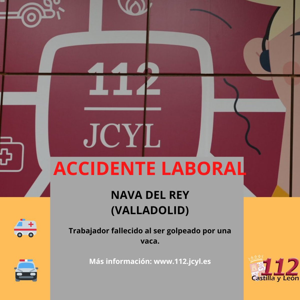 El 112 ha recibido sobre las 10.40 horas de este martes un aviso sobre un trabajador que se encontraba incosciente tras el golpe de una vaca, por lo que la sala de operaciones ha avisado del incidente a la Guardia Civil (COS) de Valladolid y a Emergencias Sanitarias - Sacyl, que ha enviado una UVI móvil y un equipo médico del centro de salud de la zona.