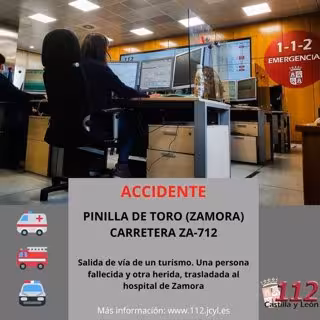 Una persona fallecida y otra herida es el balance de un accidente de circulación registrado a primeras horas de la mañana de esta jueves, 29 de junio, en la carretera ZA-712 a las afueras del término zamorano de Pinilla de Toro, según los datos que aporta el Servicio de Emergencias de Castilla y León 112 recogidos por Europa Press.