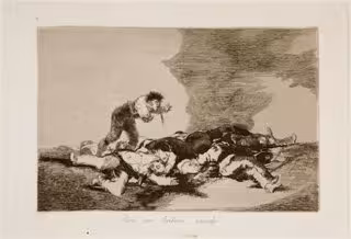 En los Desastres de la guerra, serie compuesta por 80 estampas realizadas entre 1810 y 1820 que vio la luz en 1863, cuando fue publicada por la Real Academia de Bellas Artes de San Fernando, Goya se manifiesta "crudo y penetrante" con las crueldades cometidas por soldados y por paisanos durante la Guerra de la Independencia española.