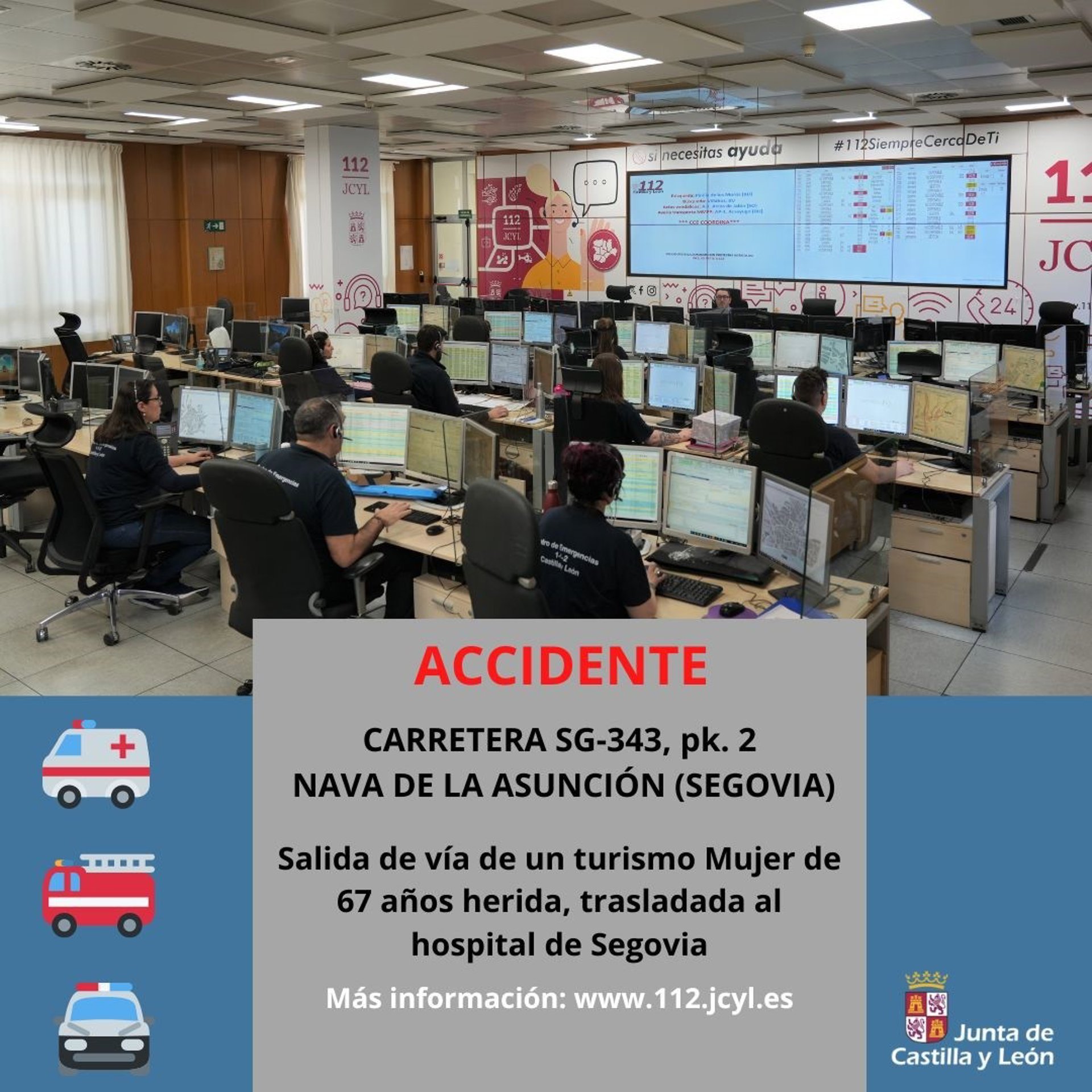El 112 ha avisado de este accidente a la Guardia Civil (Tráfico) de Segovia, a los Bomberos de Segovia y también, por proximidad, a los de la Diputación de Valladolid. Asimismo, ha informado al centro coordinador de urgencias (CCU) de Emergencias Sanitarias - Sacyl, que ha enviado una ambulancia de soporte vital básico y personal sanitario de Atención Primaria del centro de salud de Nava de la Asunción.