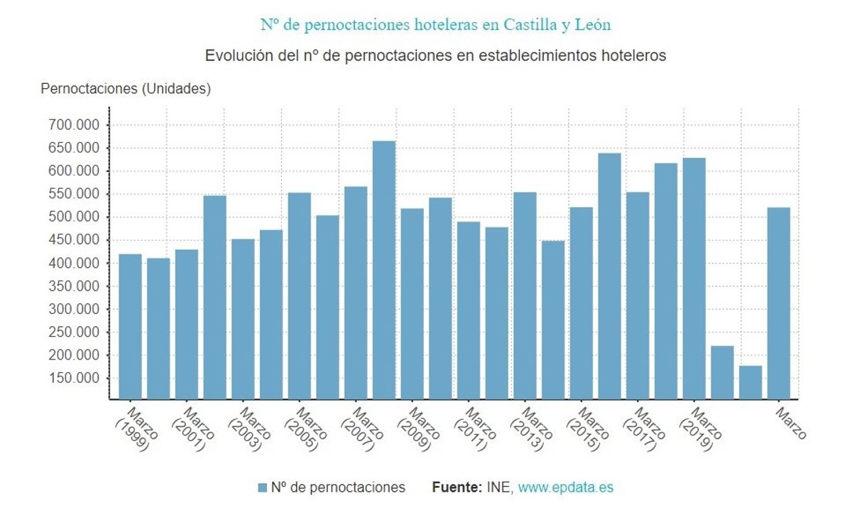 Los hoteles de Castilla y León computaron un total de 520.993 pernoctaciones en el mes de marzo de 2022, un 193,91 por ciento más que en el mismo mes del año anterior, cuando se quedaron en 177.261, por lo que se multiplican por tres.