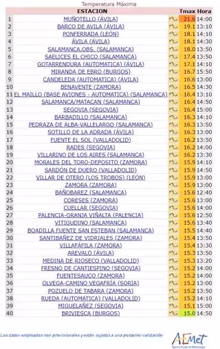 A continuación se encuentran Saelices el Chico (Salamanca), con 17,4 grados; Goterrendura (Ávila), con 17,1 grados; Miranda de Ebro (Burgos), con 16,7 grados; Candeleda (Ávila), con 16,6 grados, y Benavente (Zamora), con 16,5 grados en décimo lugar de este ranking de máximas que cierra Briviesca (Burgos) en el puesto 30 con 15,0 grados.