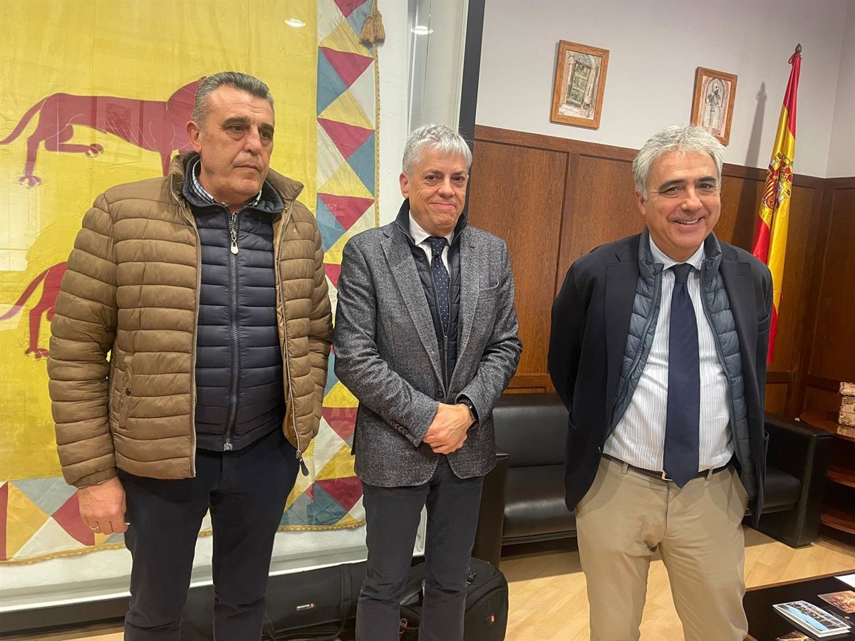 El concejal de Obras del Ayuntamiento de Astorga (León), Ángel Iglesias; el delegado territorial de la Junta en León, Eduardo Diego; y el director general de Patrimonio Cultural, Juan Carlos Prieto, tras la firma del convenio. - EUROPA PRESS