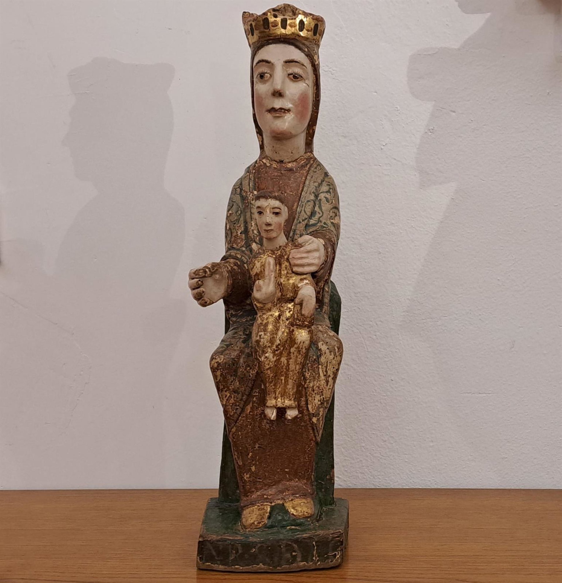 La policromía no es la original y fue tallada en el siglo XIII, para permanecer expuesta al culto de espaldas a un fondo, por lo que solo se talla, en altorrelieve, el frente de la pieza.