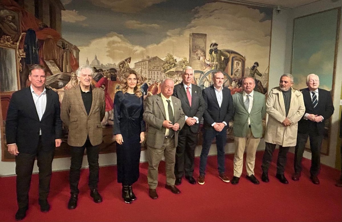 Santonja C), el presidente de la Diputación de Burgos, la viceconsejera de Acción Cultural o los comisarios de la muestra en la foto de familia de presentación de la exposición de tapices en el MEH. - JCYL