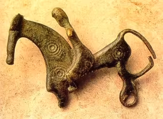 La fíbula, un imperdible usado para unir piezas de vestir, pudo haber formado parte del ajuar funerario de una tumba de incineración situada en la orilla del Torío. En este caso, la pieza representa un jinete con casco y bandoleras sobre un caballo, lo que ha llevado a pensar que perteneció a un guerrero de su tiempo, han informado fuentes de la Delegación Territorial.