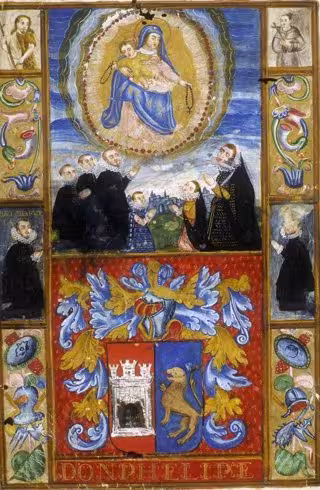 La ilustración que aparece en la primera página representa en un recuadro superior al hidalgo don Fernando junto a su familia recibiendo sendos rosarios de la Virgen y el Niño.