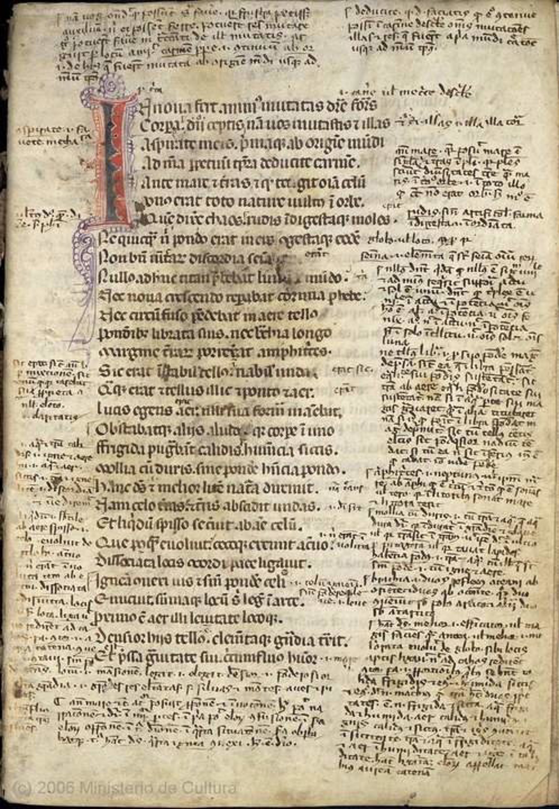 Se trata de un manuscrito en pergamino de 199 folios y letra gótica, con encuadernación en vitela marrón sobre madera. Contiene numerosas notas marginales y glosas que son interpretaciones de lugares, palabras y correcciones al texto.