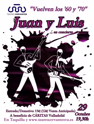 La música española de los años '60 y 70' volver a sonar en el teatro Cervantes de la capital vallisoletana de la mano de 'Juan y Luis' que ofrecerán un repertorio con canciones de 'Los Brincos', 'Juan & Junior', 'Dúo Dinámico', 'Los Ángeles', 'Los Mitos', 'Cánovas Rodrigo Adolfo y Guzman', 'Los Pasos', 'Juan Pardo', 'Fórmula V', 'Los Mustang' o 'Los Salvajes'.