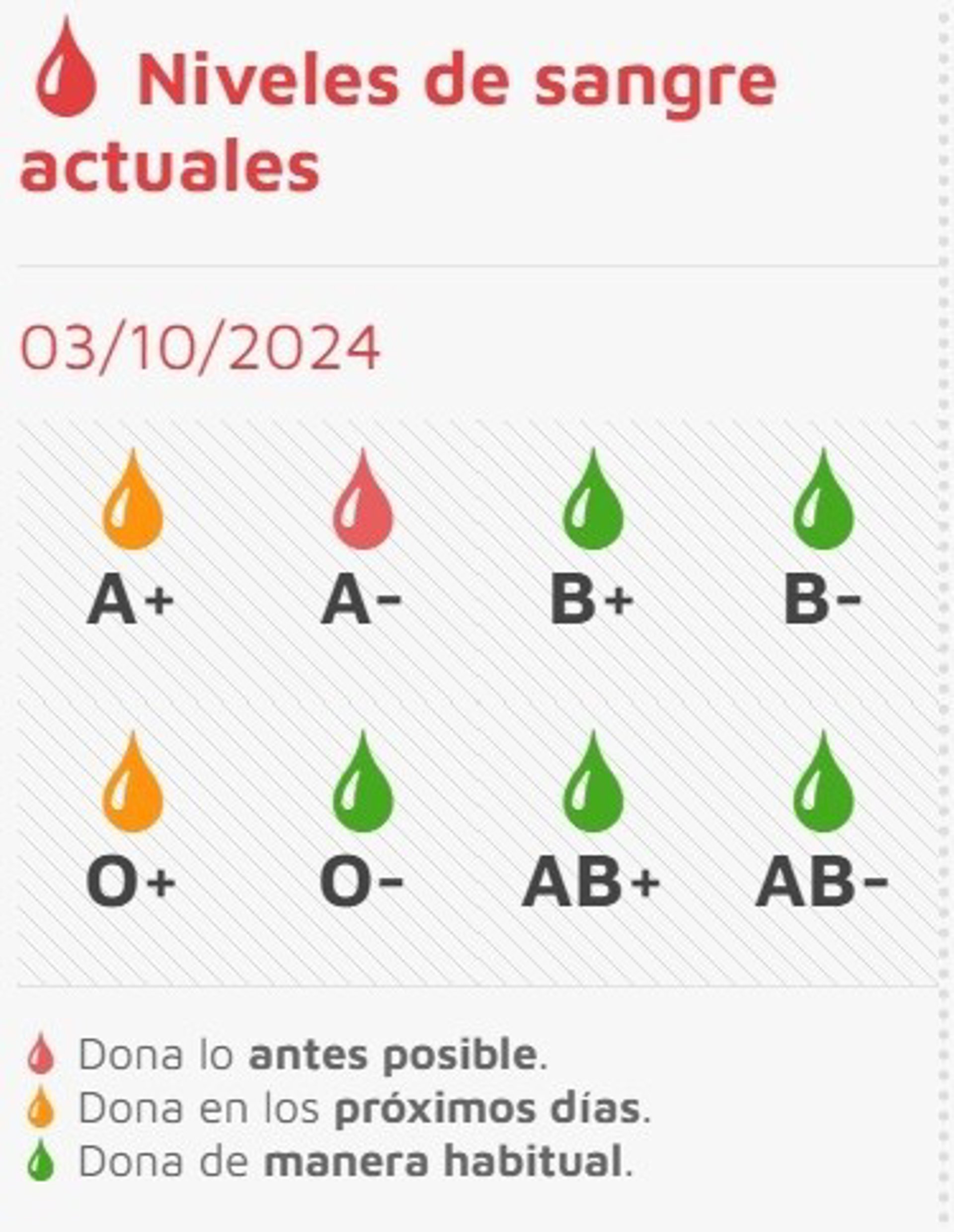 Por otra parte, el resto de reservas de los grupos B+,B-,0-,AB+ Y AB- se encuentran en niveles verdes, por lo que se llama a donar de forma habitual, según ha informado el Chemcyl a través de la página web oficial.