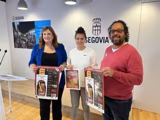 La alcaldesa de Segovia, Clara Martín, junto a Félix Maroto y Ainhoa Montes, representantes de la asociación de vecinos La Parrilla, del barrio de San Lorenzo, han presentado la vigésimo séptima edición de las 'Noches de Música en el Atrio', que se celebrarán entre el 19 de mayo y el 16 de junio.