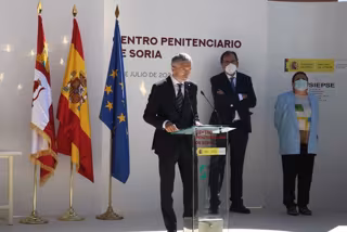 Grande-Marlaska ha definido la nueva cárcel de Soria como un "espacio sostenible, respetuoso con el medio ambiente, con un diseño arquitectónico que compagina con un diseño no agresivo con el respeto a los derechos de los internos, nuevos espacios, modernas tecnologías y servicios actualizados".
