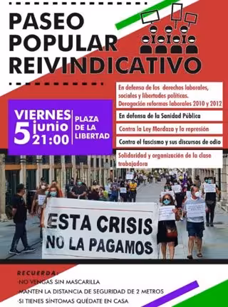 Diversos colectivos ya celebraron una movilización similar el pasado 29 de mayo y vuelven a salir a la calle este viernes en una convocatoria en la que especifican que hay que acudir con mascarilla, mantener la distancia de dos metros y no asistir si presenta síntomas compatibles con el coronavirus.