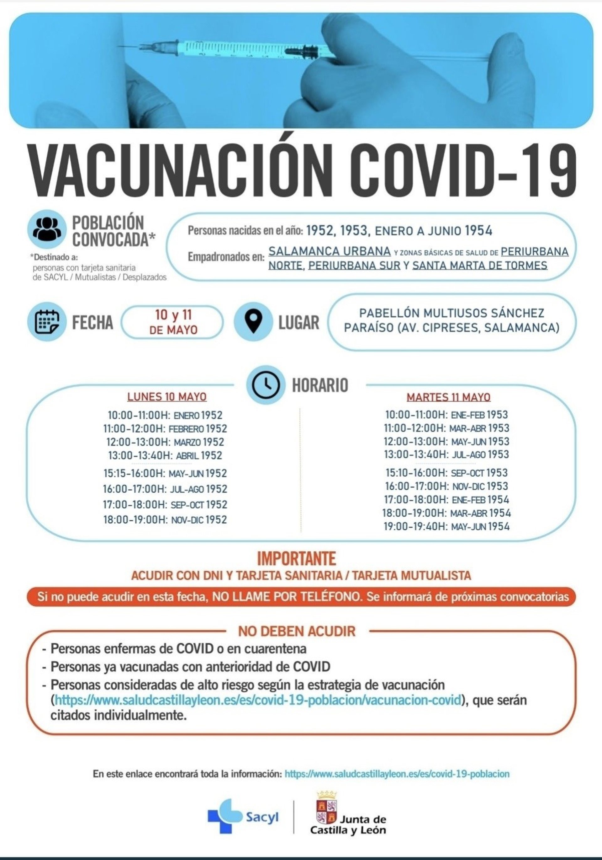 La Junta de Castilla y León ha organizado nuevas vacunaciones masivas en el Multiusos Sánchez Paraíso de Salamanca los próximos lunes y martes, 10 y 11 de mayo, para vecinos de Salamanca capital, Periurbana Sur, Periurbana Norte y Santa Marta de Tormes, nacidos en 1952, 1953 y de enero a junio de 1954.