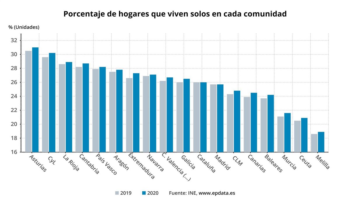 En cuanto al tamaño medio del hogar, Castilla y León presenta la segunda menor cifra (2,29 miembros por cada hogar frente a 2,31 el año pasado), sólo superada por Asturias (2,20 miembros). De hecho, un 30,2 por ciento de los hogares castellanoleoneses está formado por un único integrante --de nuevo la segunda comunidad con mayor índice de hogares unipersonales tras Asturias, con un 31,0 por ciento--, mientras que el 32,4 corresponde a parejas, igual que en 2018 y en 2019.