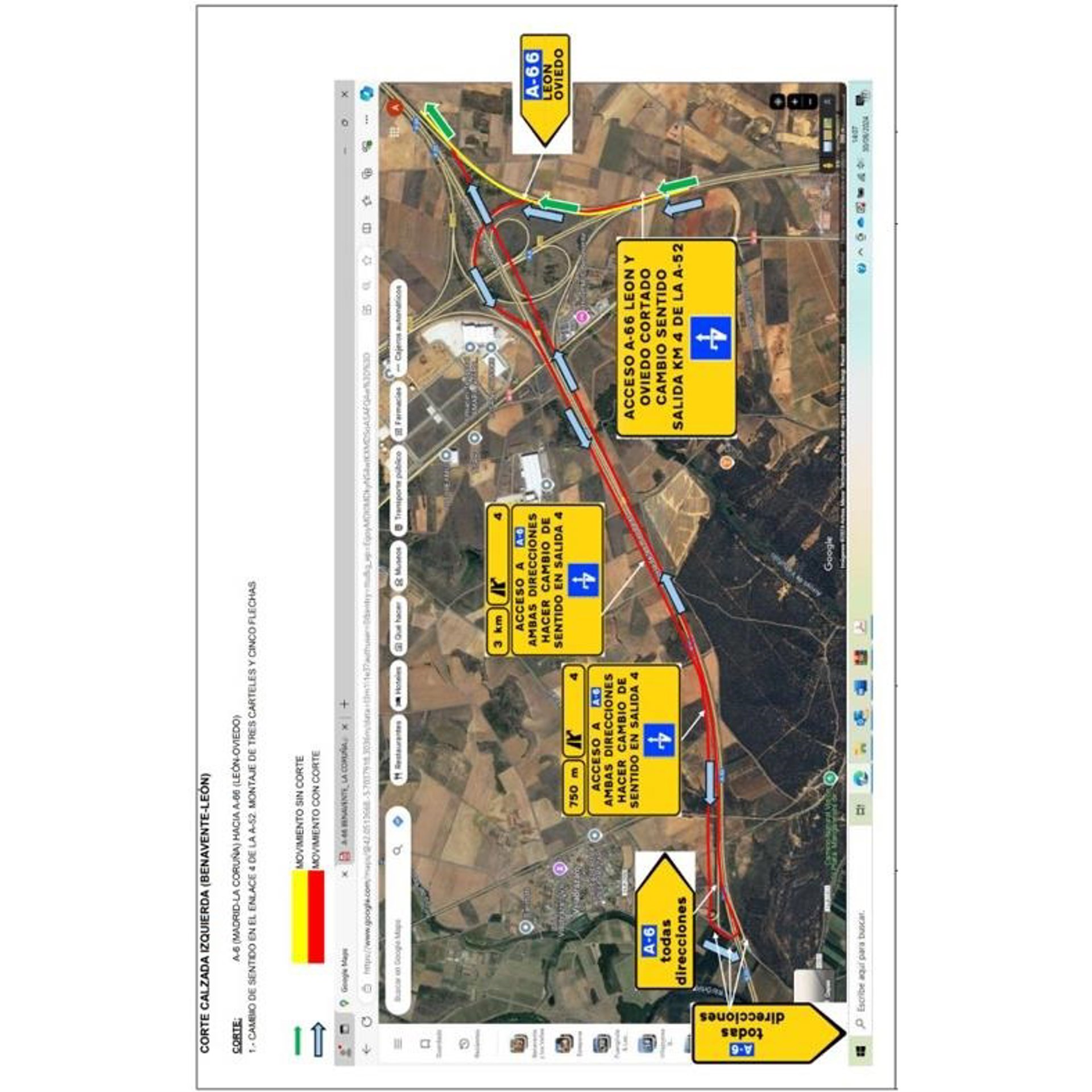 Asimismo, se cortará el ramal 268B A-6 del enlace A-6/A-66/A-52 desde A-6 dirección Madrid hacia A-66 dirección León, con desvío de tráfico por ramal 268A hacia enlace E-4 de Villabrázaro de la A-52, realizando cambio de sentido para tomar dirección León.