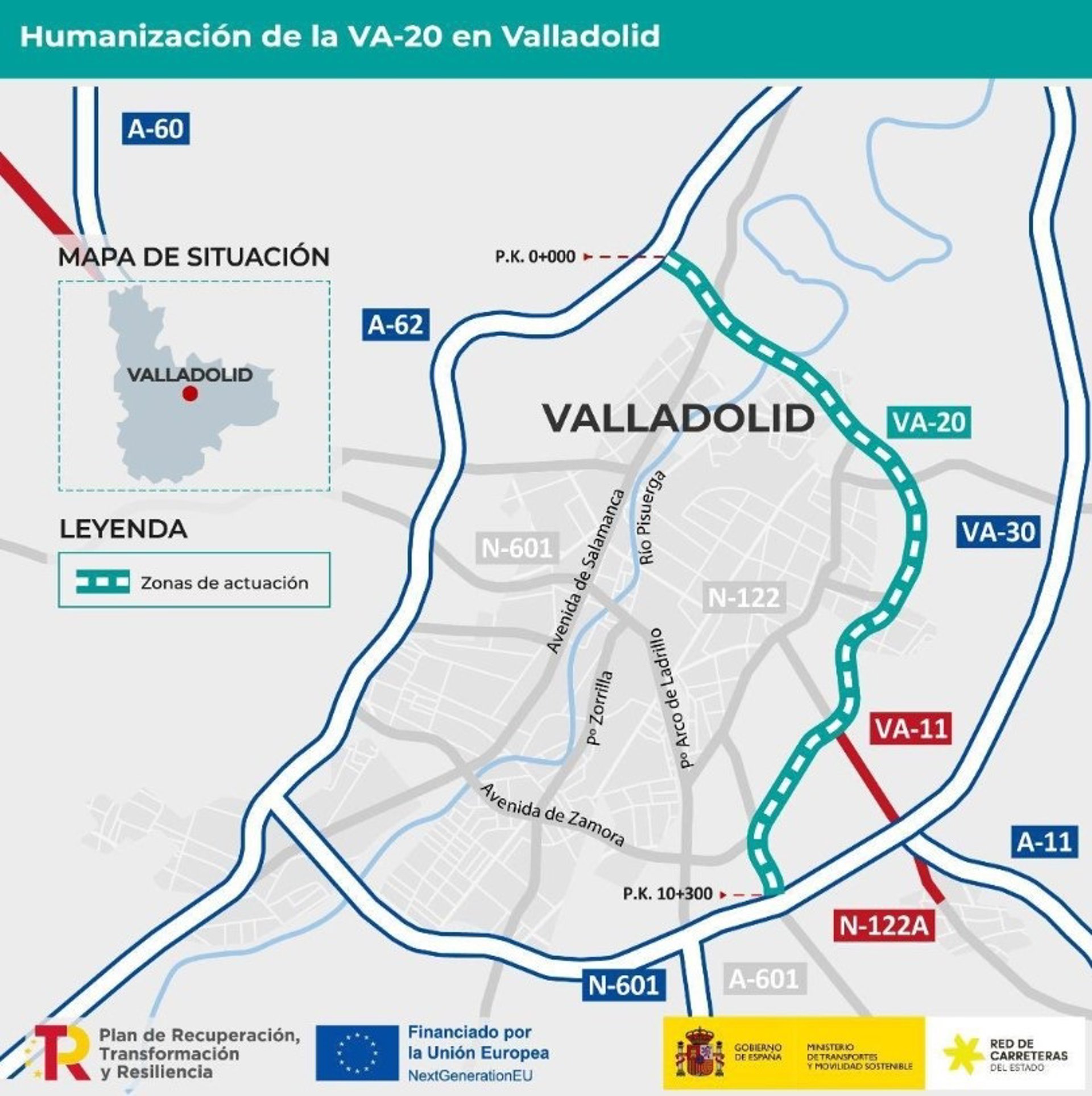 Esta actuación de "humanización" de la ronda interior del municipio de Valladolid afectará el trayecto de esta vía entre los puntos kilométricos 0 y 10,3, desde el enlace con la N-620a hasta la glorieta de inicio de la VA-30, junto a la conexión con la A-601 (ambas incluidas).