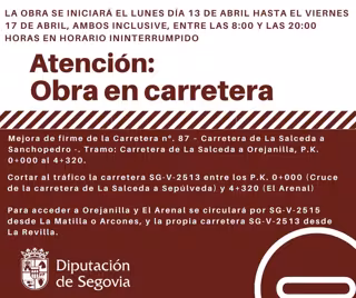 Posteriormente, se aplicará la señalización horizontal de la calzada y el recrecido de arcenes. Para la ejecución, es necesario cortar al tráfico la carretera SG-V-2513, entre el cruce de La Salceda a Sepúlveda y El Arenal, desde el lunes 13 de abril hasta el viernes, día 17, ambos inclusive.